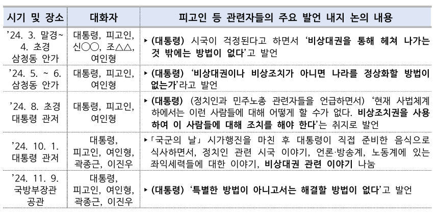 ◎ 대통령은 적어도 ‘24. 3. 경부터 비상계엄을 염두에 두고 피고인 등과 여러 차례 논의한 사실 확인, ‘24. 11. 경부터는 실질적인 준비가 진행되었음